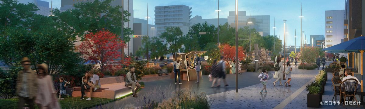 再開発の中心となる「ニワミチよっかいち」プロジェクトでは、JR四日市駅と近鉄四日市駅を直線で貫く、距離1.6km幅70mの中央通りに広場や歩行者専用通りなどを設置して、歩行者を中心とした人が集まる空間に生まれ変わるよう整備を進めています。